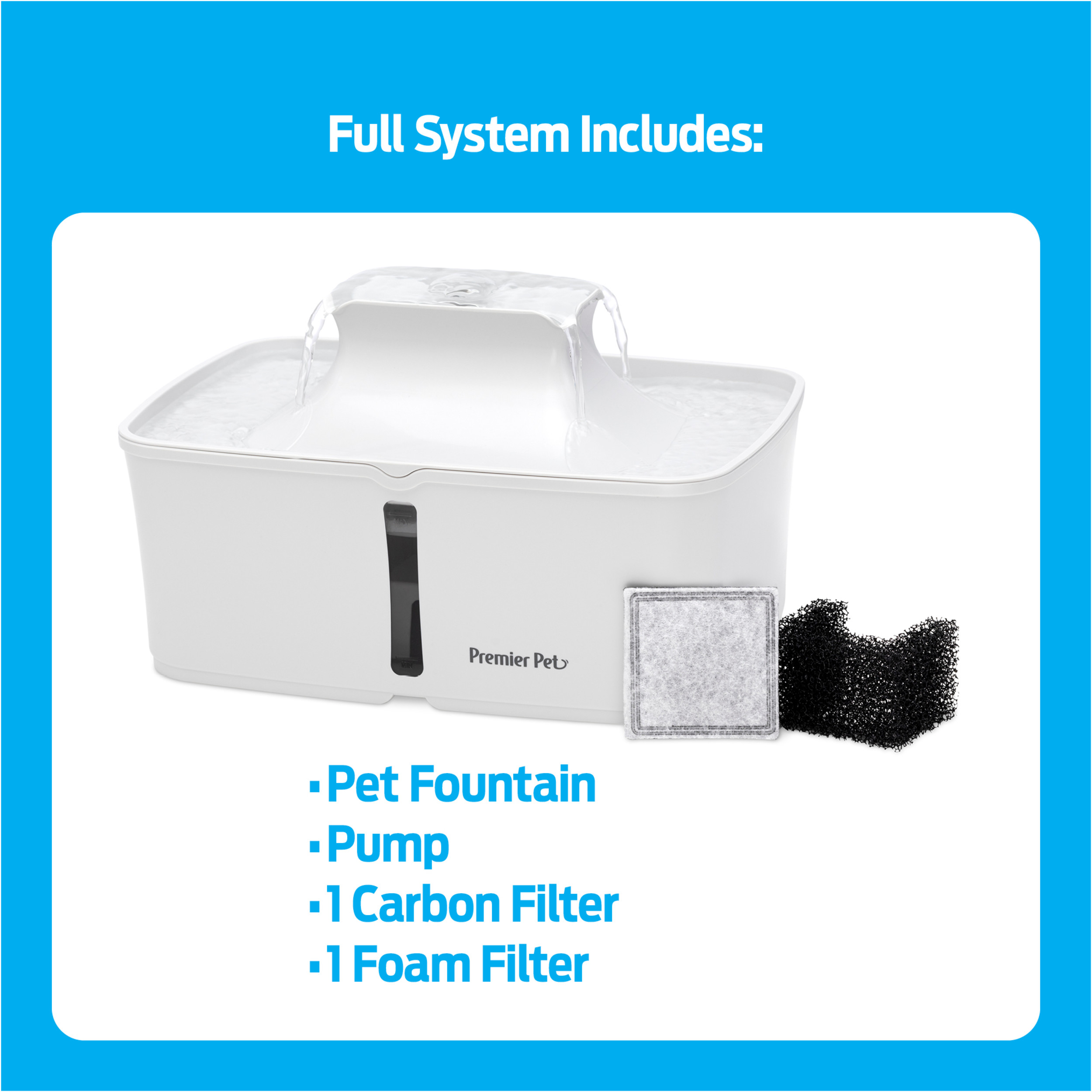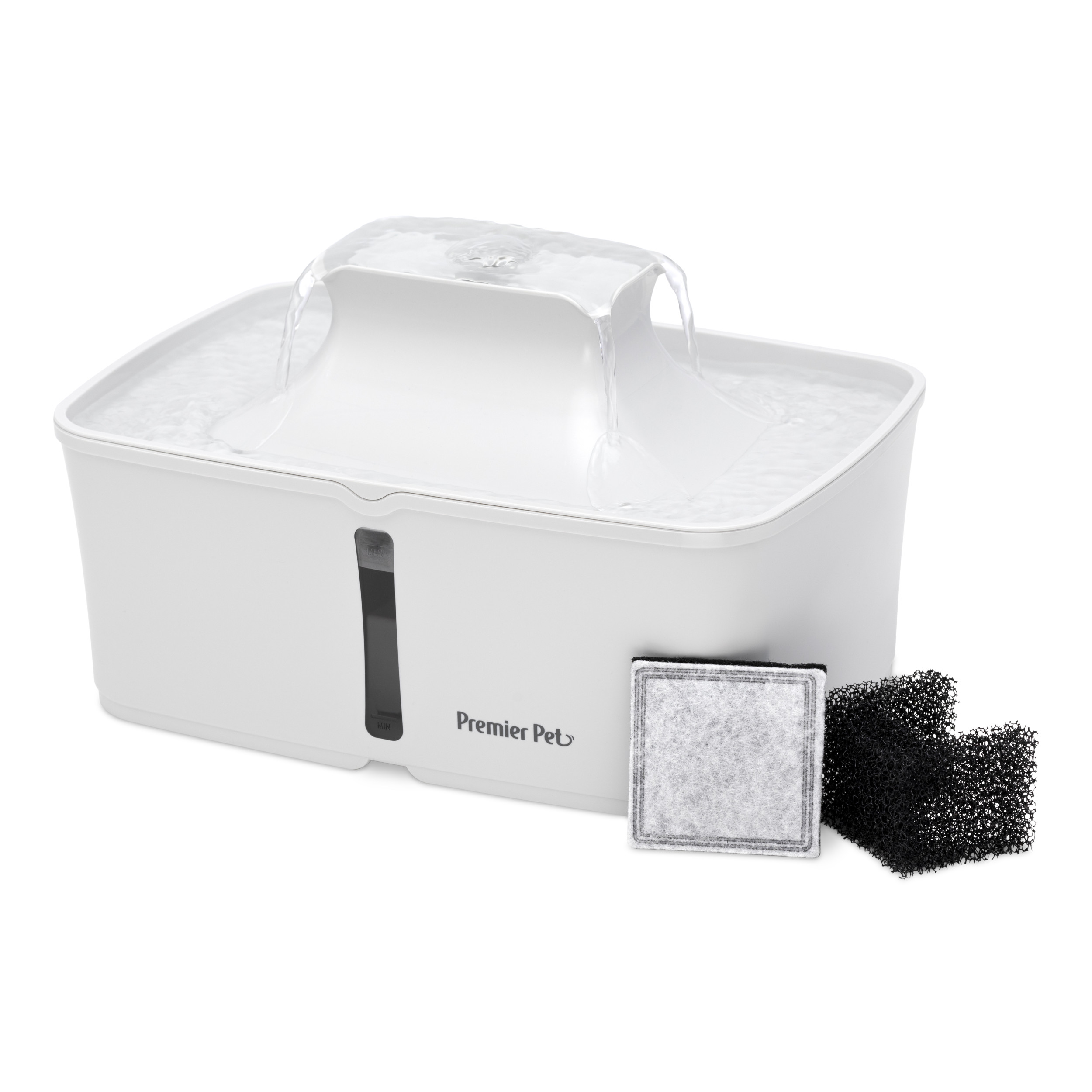 The Premier Pet 128 oz. Fountain provides up to 128 ounces of fresh, filtered water for dogs, cats, & multi-pet homes. 4 free-falling streams encourage pets to drink more, promoting proper hydration to support urinary & kidney health, & a built-in Dual-Filtration System removes dirt, hair, bad tastes & odors. The constant flowing water, which can be adjusted with a flow-control knob, helps to prevent bacteria growth, keeping the fountain cleaner than a standing water bowl. The new sleek, compact design features a water level window to view refill need & offers your pet multiple drinking options: 4 free-falling streams or the lower bowl with still water. This BPA-Free plastic fountain comes apart for easy cleaning & is top-shelf dishwasher safe (excluding pump). Give yourself the happier, healthier pet you deserve by giving them the Premier Pet 128 oz. Pet Fountain!