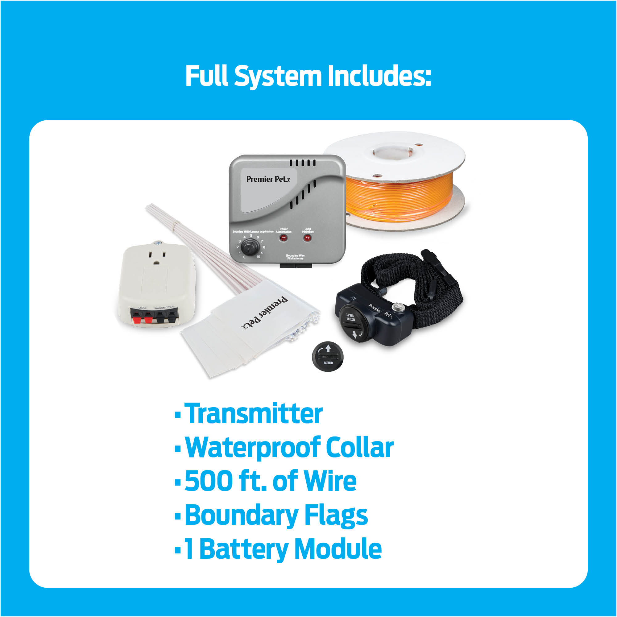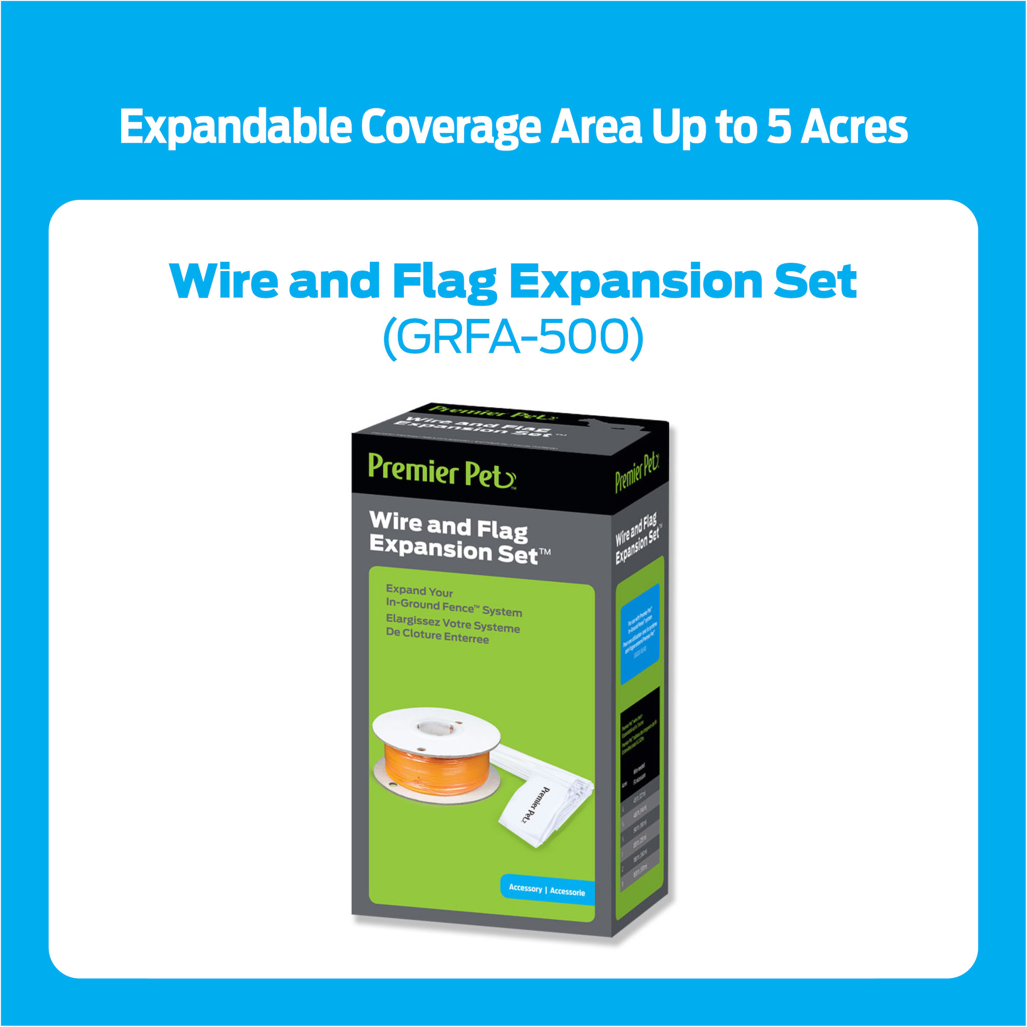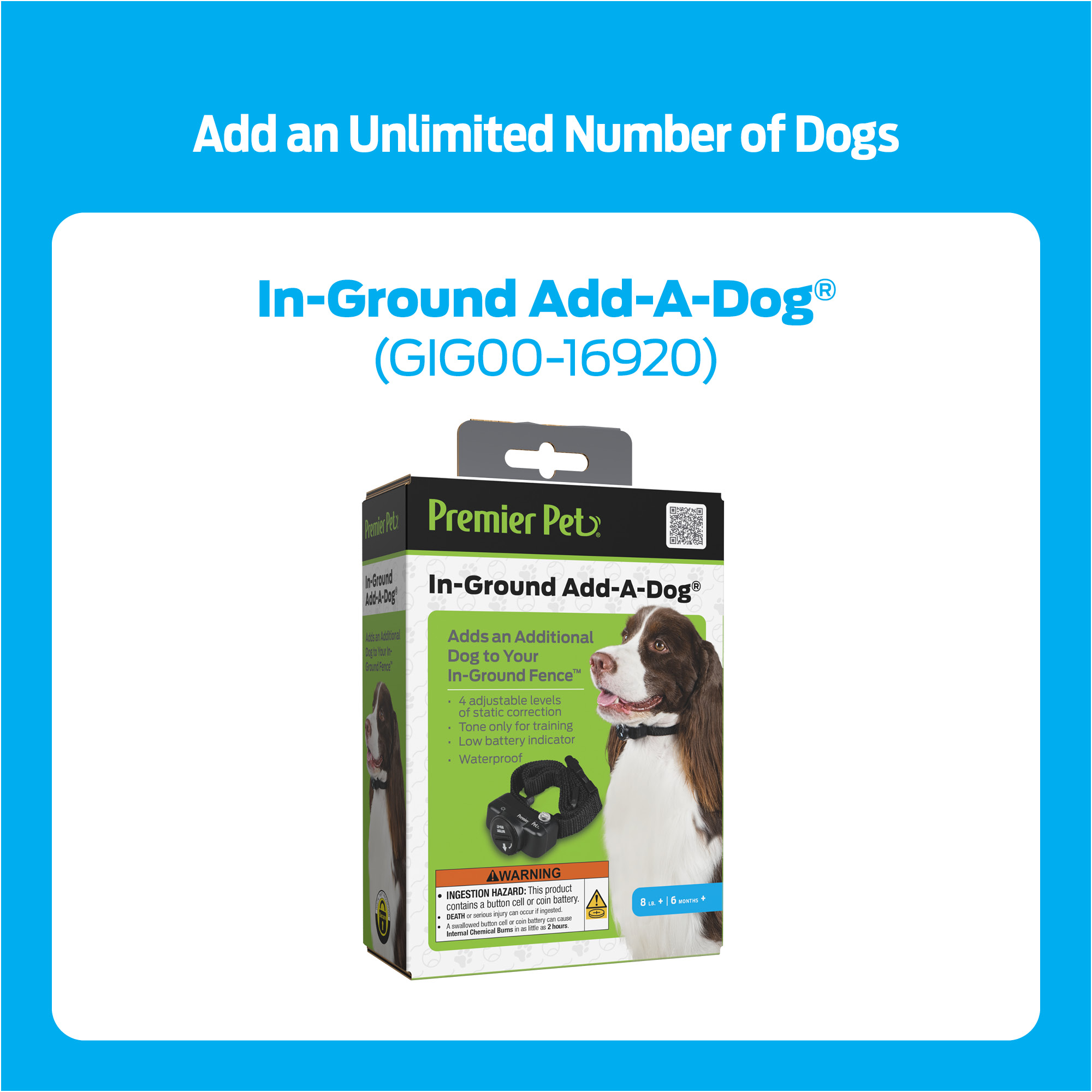 The Premier Pet® In-Ground Fence keeps your dog safely in your yard with a customizable barrier that includes coverage up to 1/3 acre and is expandable up to 5 acres with the Premier Pet® Wire and Flag Expansion Set (GRFA-500). The barrier can be customized to contain your dog in your entire yard, a partial area of your yard, or to prevent access to certain areas, such as a garden or pool. The included waterproof receiver collar has a nylon strap that is adjustable up to 26”, making it a great fit for both smaller and larger dogs. A low battery indicator on the collar will alert you when the collar battery (GAC11-16351) should be replaced. The collar has 1 level of tone only for training and 4 adjustable levels of static correction so that you are able to choose which level works best for your dog. A safety time-out feature will stop correcting after 30 seconds should your dog get outside of the boundary zone. You also have the option of adding an unlimited number of dogs to the system with the Premier Pet In-Ground Add-A-Dog collar (GIG00-16920). Give your dog freedom to play and yourself peace of mind with the Premier Pet In-Ground Fence!